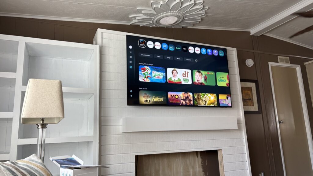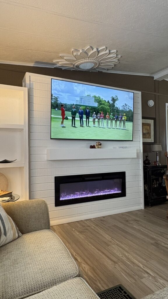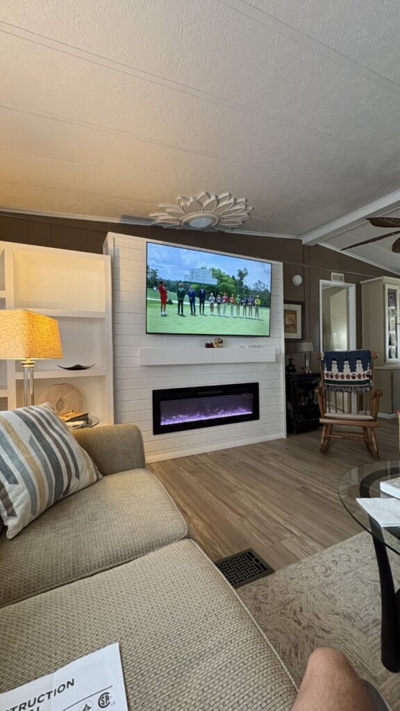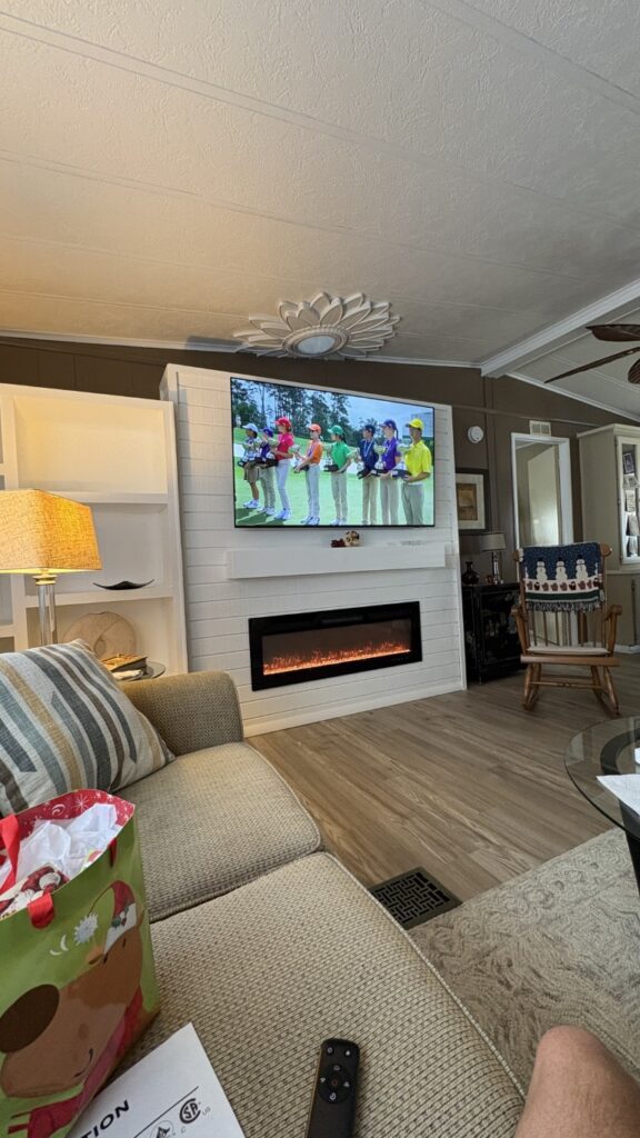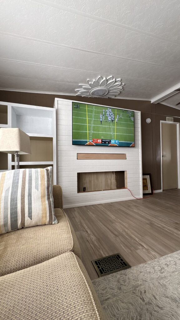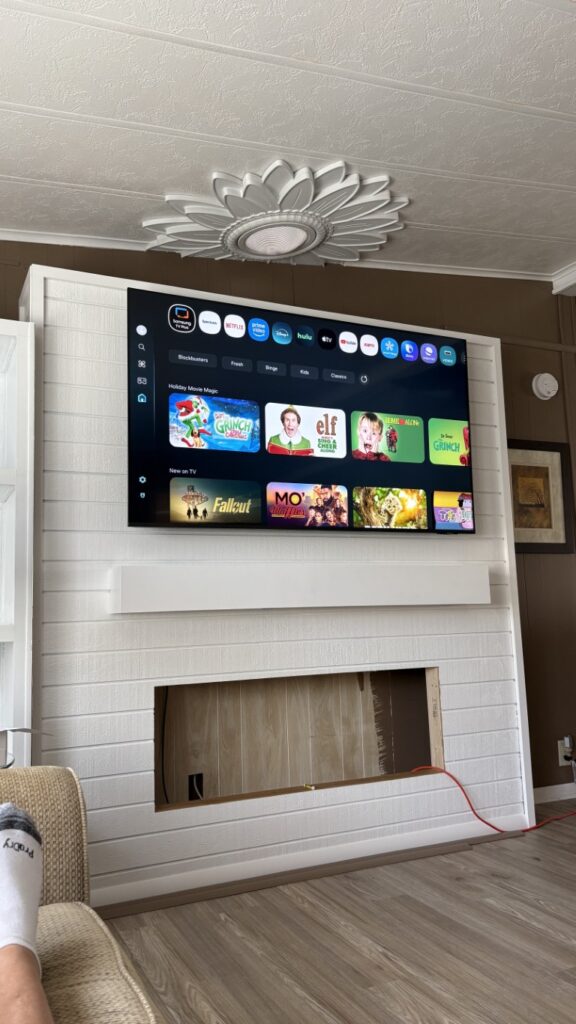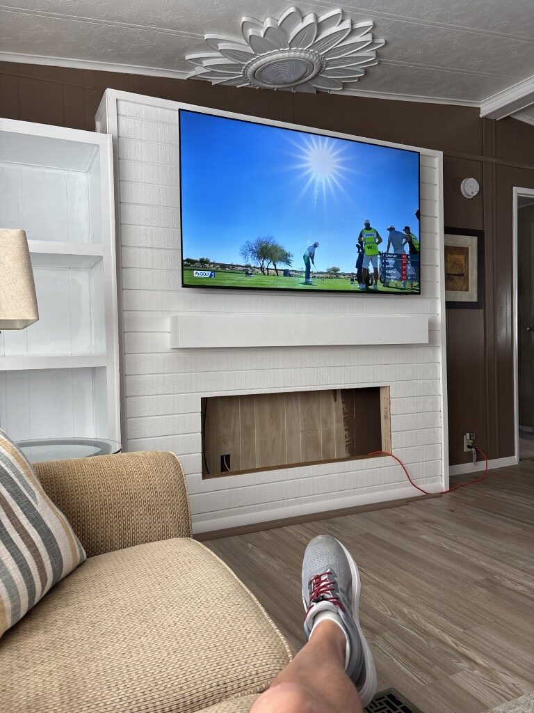 The TV was mounted… the 20amp circuit for the fireplace hadn’t been installed yet, so I simply ran an extension to the outlet to take it for a test drive, proportionally it really looks good…
