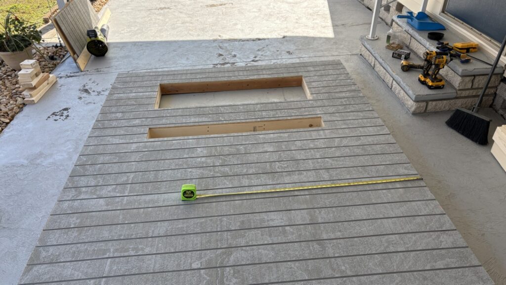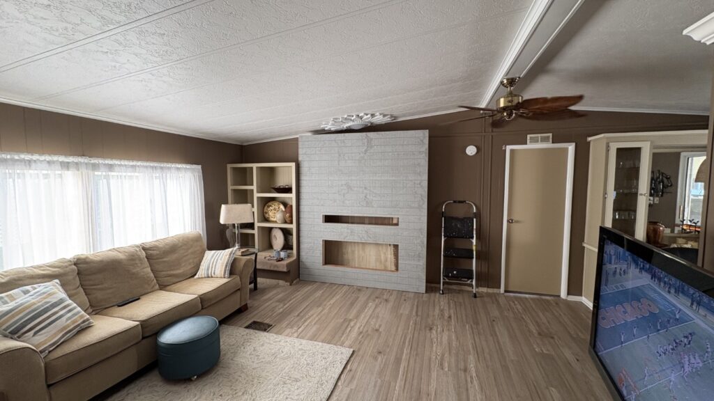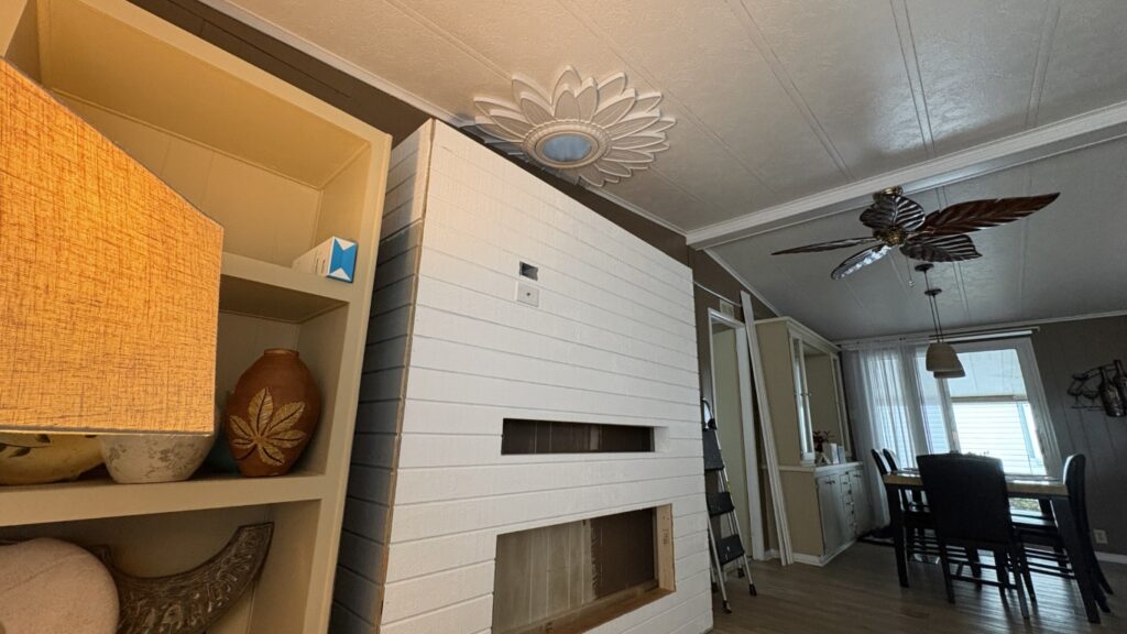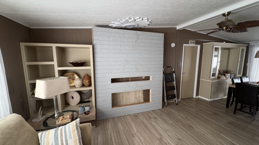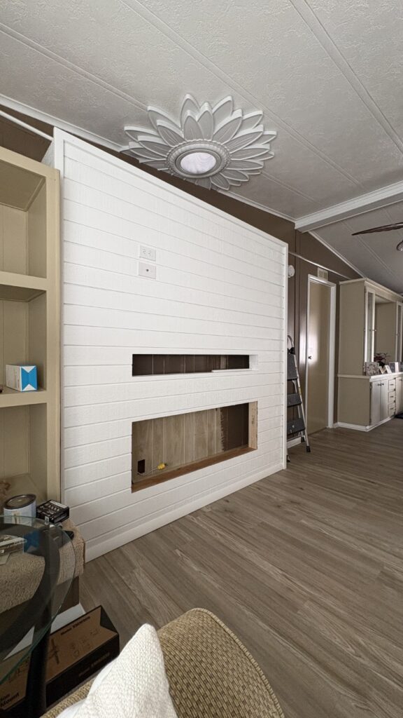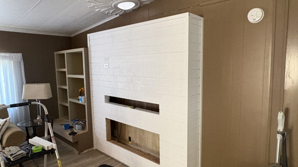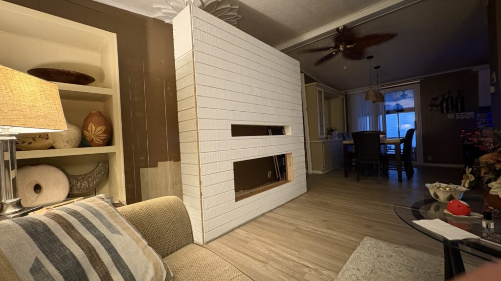 The TV was mounted… the 20amp circuit for the fireplace hadn’t been installed yet, so I simply ran an extension to the outlet to take it for a test drive, proportionally it really looks good…